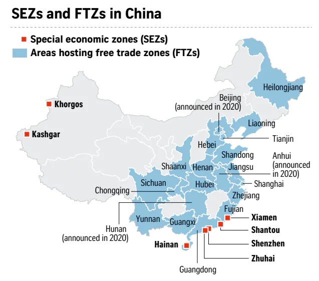 К свободным экономическим зонам Китая относятся: Шеньчжень, Чжухай, Гуанчжоу, Сямэнь, Фучжоу, Пинтан , Тяньцзинь, Шанхай — Новый район Пудун.