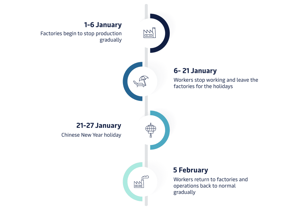 - Постарайтесь сделать заказ заранее, как минимум за две-три недели до Нового года, берите больший запас дней до официального наступления праздников. Так как в Китае перестают работать практически все, то также заранее уточните сроки производства, сроки поставки и т.д.